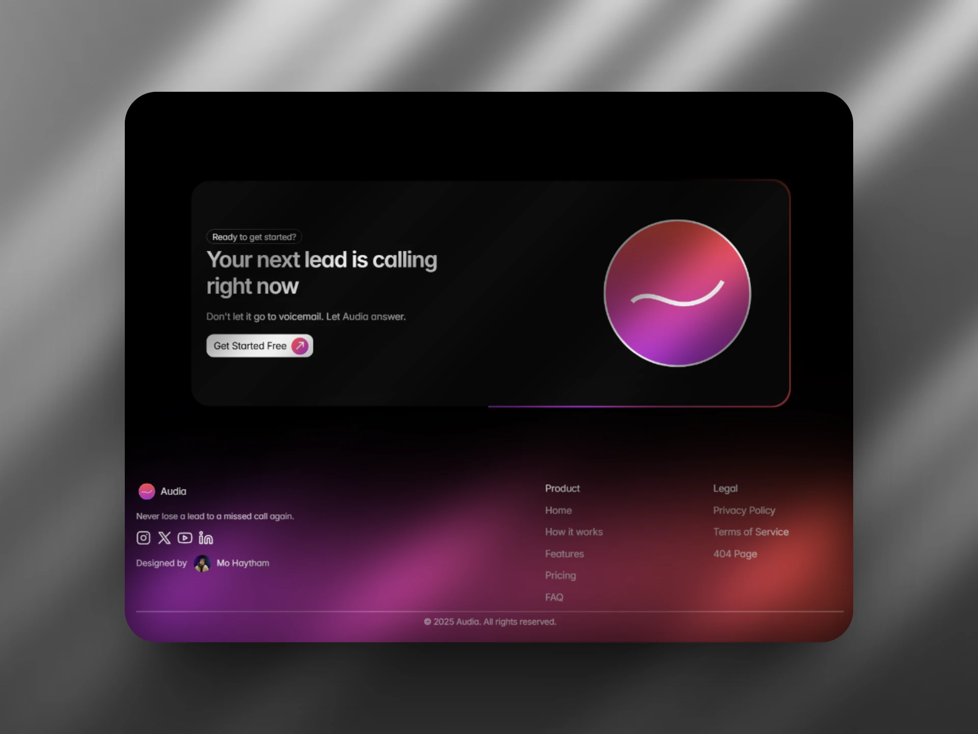 Turn calls into customers with Audia. A complete, conversion-optimized landing page template built specifically for AI call agent businesses. Everything you need to launch fast and start selling. Design Features: - Conversion-focused layout - Modern dark & light theme with polished design - Fully responsive (desktop, tablet, mobile) - Smooth animations & interactions - 404 page, Privacy Policy, and Terms of Service pages included - Easy to customize (no coding required) Perfect For: Founders building AI call agent platforms, AI receptionist services, appointment booking automation, or any business offering AI-powered phone solutions. Launch your AI agent business in minutes, not weeks.